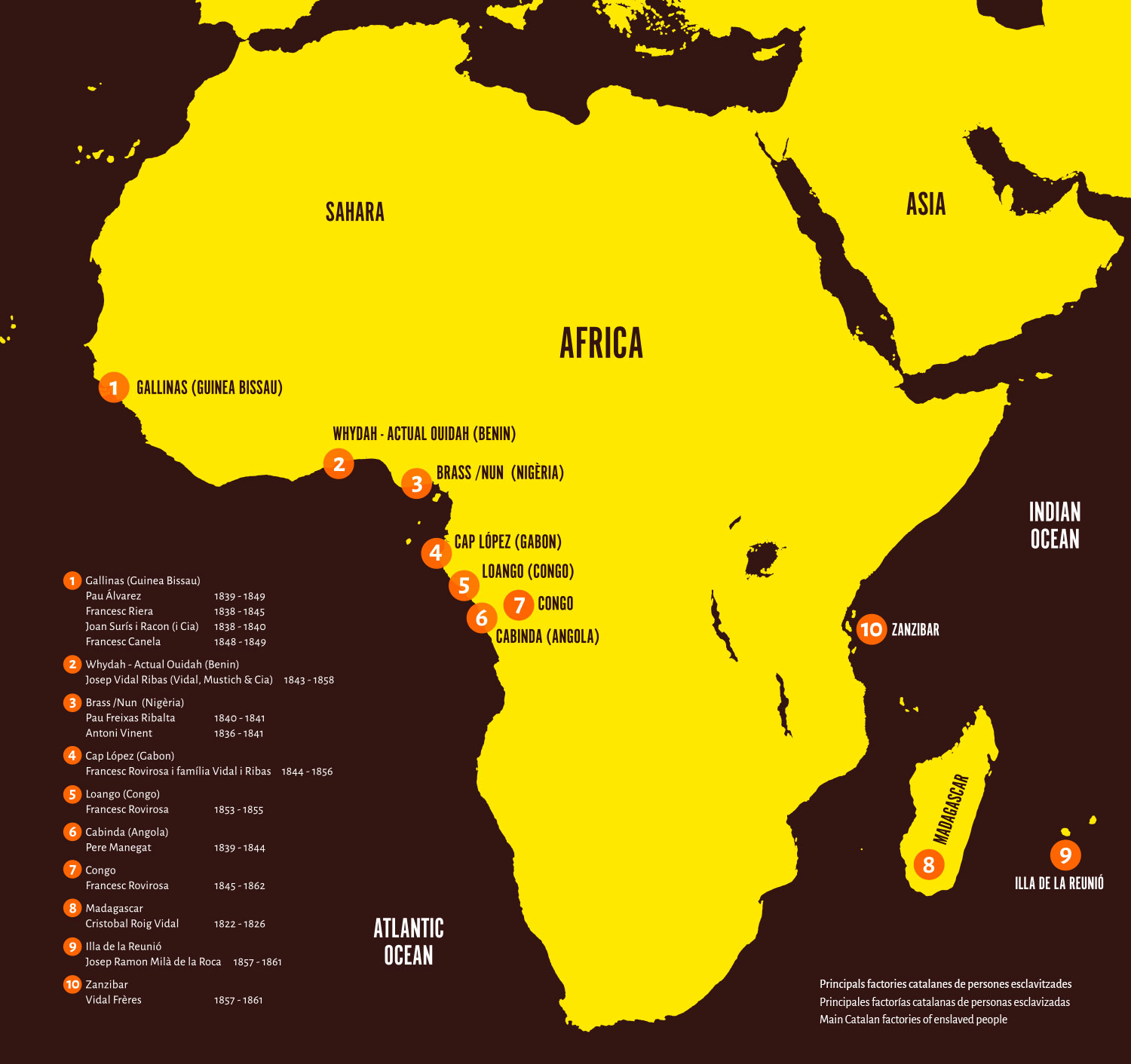 S’han identificat 63 factories de propietaris espanyols, alguns d’ells catalans. Van ser propietaris o administradors de factories a la costa africana els traficants catalans José de Bérriz, Francesc Canela, Pau Freixas Ribalta, Pere Manegat, Domènech Mustich, Pere Sala, Francesc Riera, Cristòfol Roig Vidal i Bonaventura Vidal Calzada.