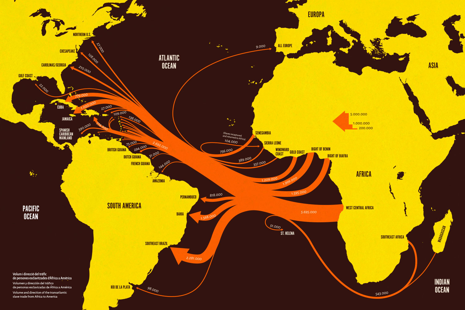 Entre els segles XVI i XIX, més de 12,5 milions de persones nascudes a l’Àfrica van ser embarcades cap al continent americà. Espanya es va convertir en el quart país d’un rànquing macabre: els grans ports esclavistes del sud d’Europa van ser Sevilla i Lisboa fins al segle XVII, i Cadis i Lisboa durant els segles XVIII i XIX. Es calcula que els vaixells dels armadors europeus o nord-americans van portar fins a l’Amèrica espanyola unes 2.072.000 persones. D’aquest total, els vaixells espanyols n’haurien transportat aproximadament 1.600.000; d’aquestes, gairebé 1.000.000 van acabar esclavitzades a Cuba.